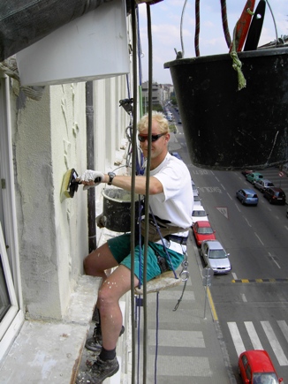 Práci provádíme pomocí horolezecké techniky, která je podstatně levnější než za pomocí lešení nebo montážních plošin či jeřábů.