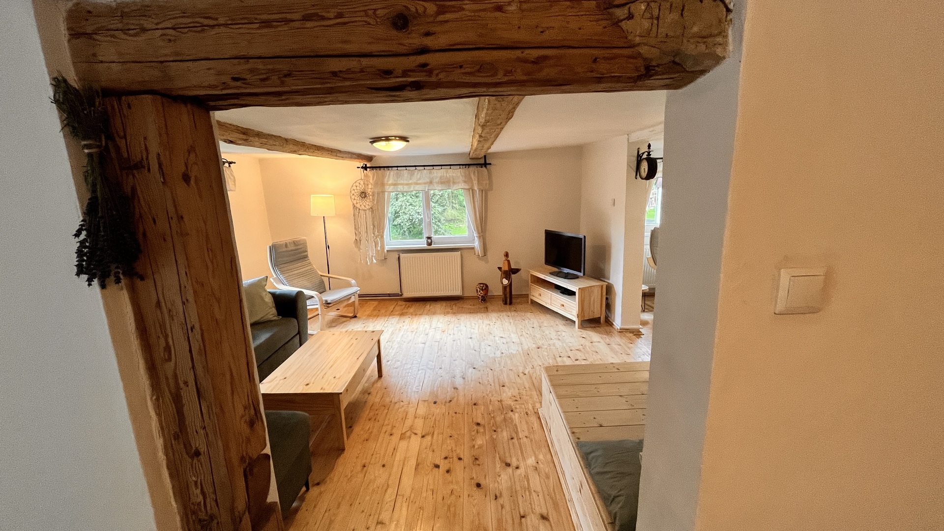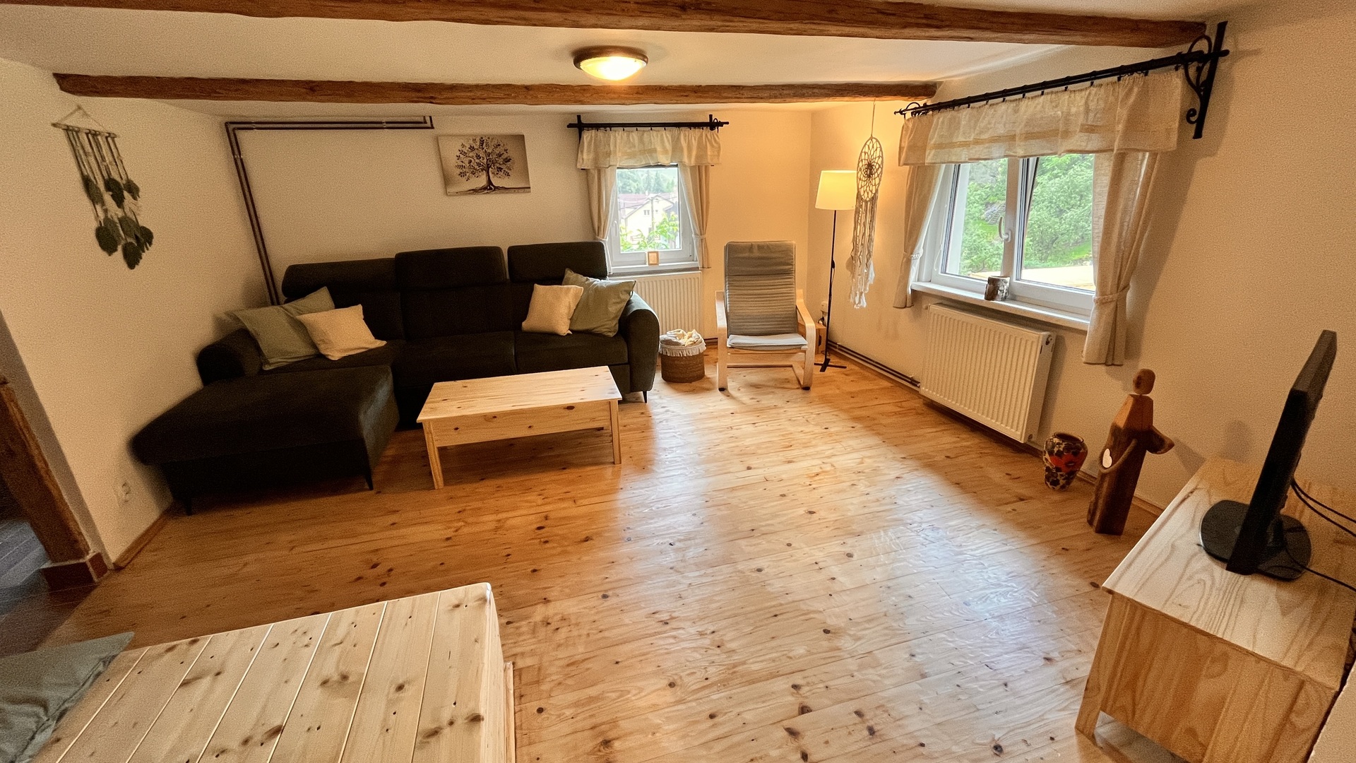 Obývací pokoj nabízí pohodlné posezení, televizi (OnePlay) a Wi-Fi připojení.