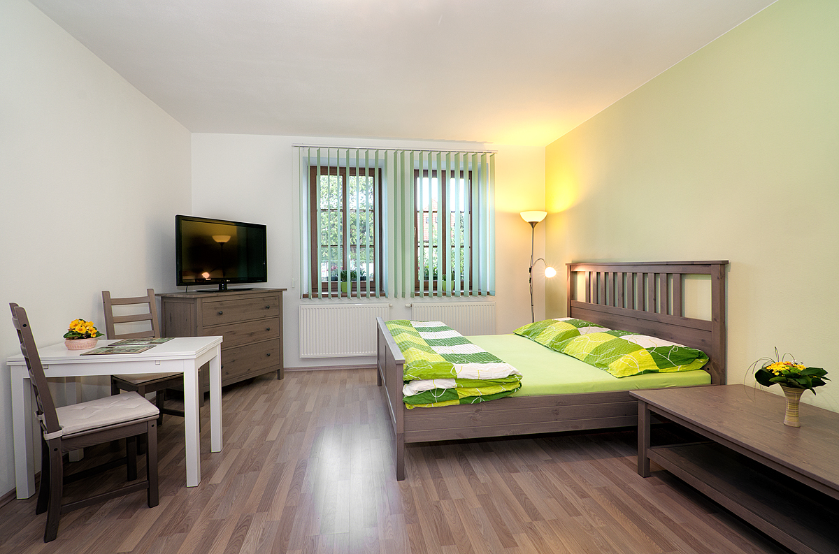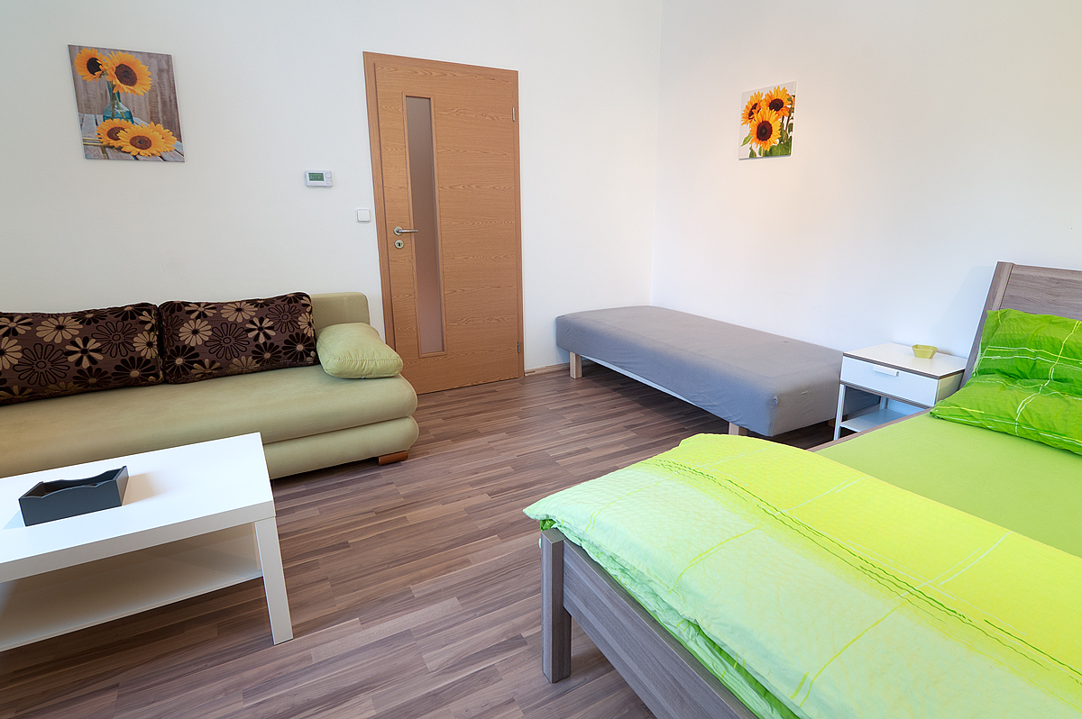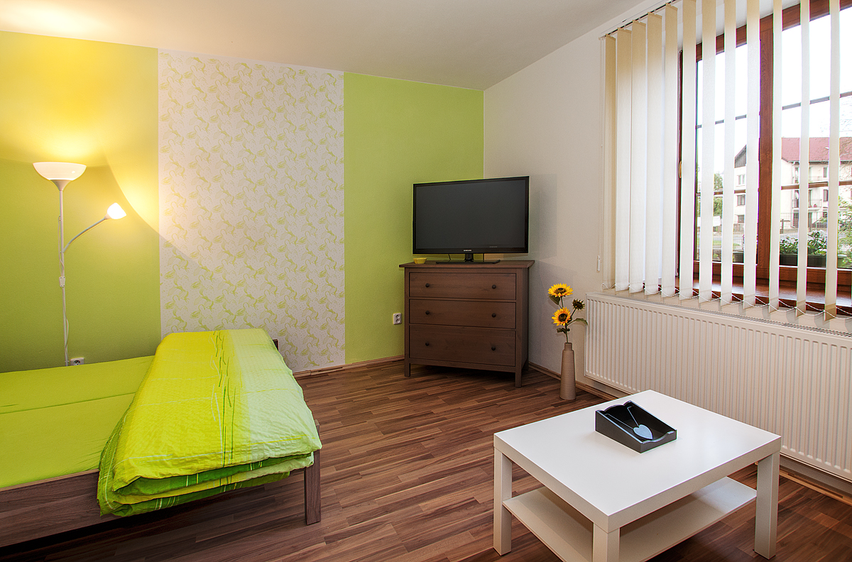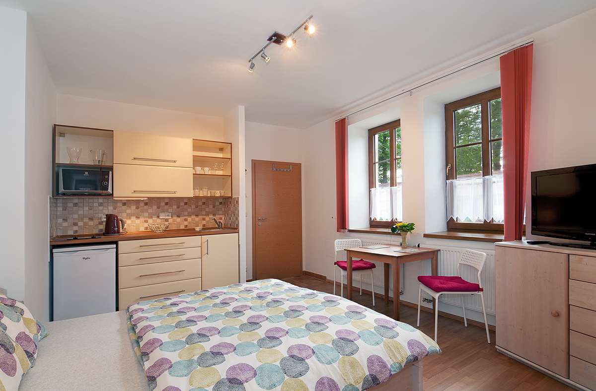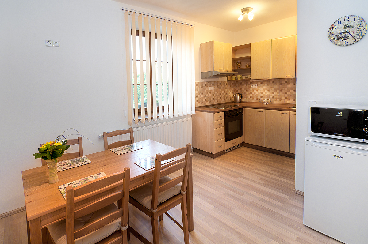 Pokoje jsou vybavené dvoulůžkovou postelí, jídelním stolem, LCD televizí, plně vybavenou kuchyní pro 2 - 4 osoby, varnou konvicí, lednicí s mrazákem, mikrovlnnou troubou, kompletním nádobím. Každý pokoj má vlastní koupelnu s WC.