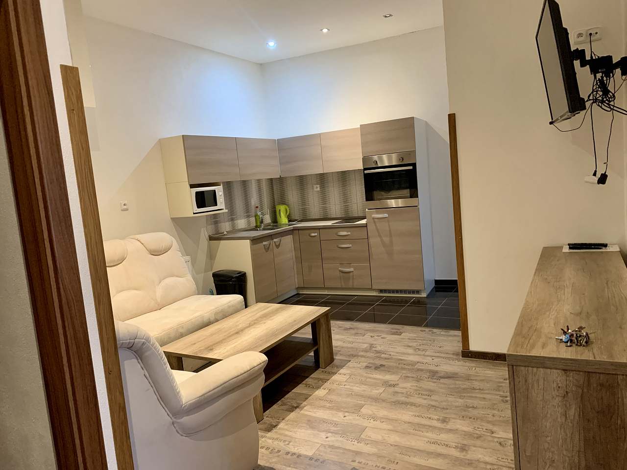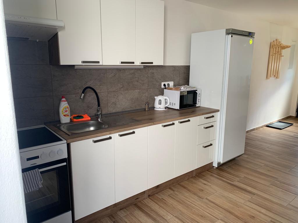 Rodinný apartmán pro 4 osoby s dvěma samostatnými ložnicemi, obývacím pokojem, vybavenou kuchyní a koupelnu s rohovou vanou a samostatným WC.