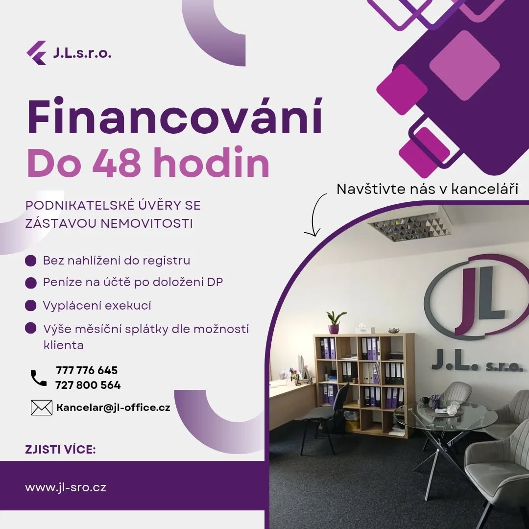 Naše společnost J.L. s.r.o. Vám nabízí podnikatelské úvěry na míru, výkupy nemovitostí, správa a pronájem nemovitostí. Pokud Vás zaujaly naše služby, neváhejte se na nás obrátit.