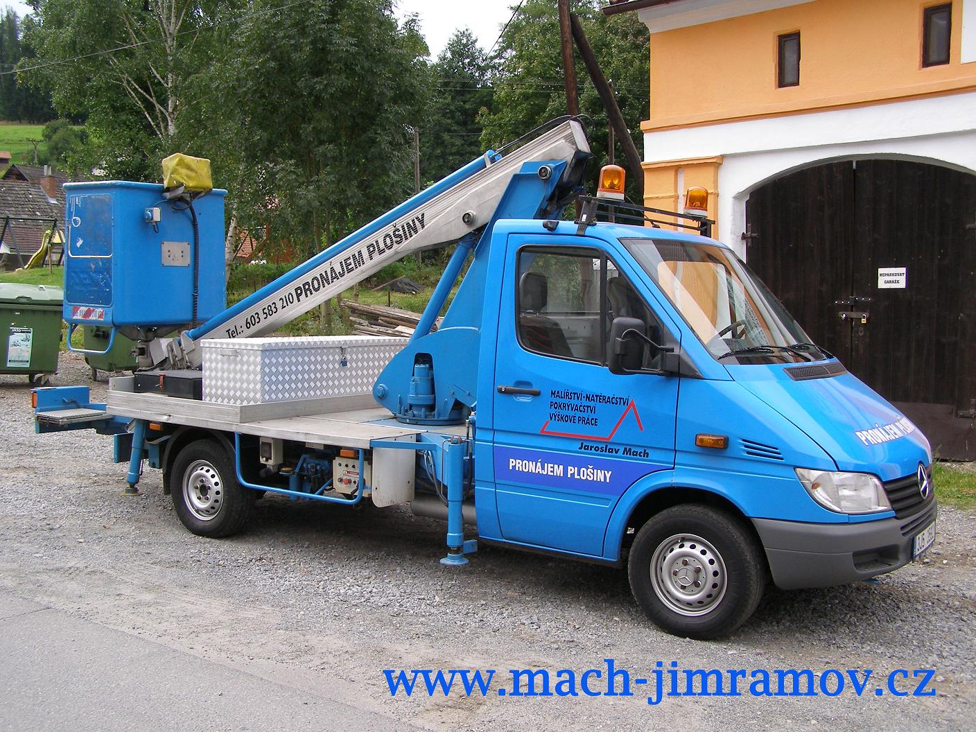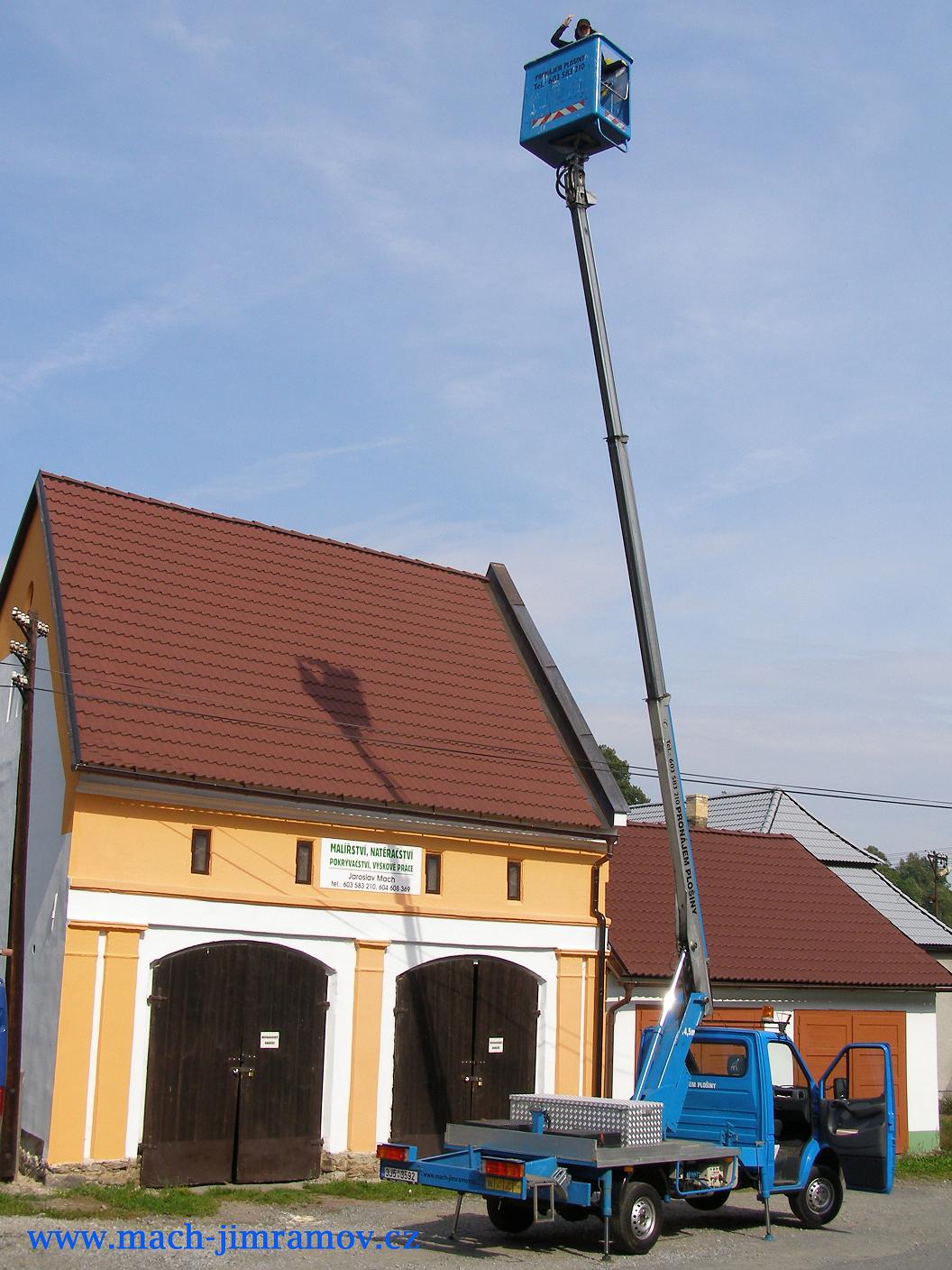 Zajišťujeme práce s plošinou - přijedeme a pomocí plošiny Vás dopravíme i do míst, kam se se žebříkem nedostanete. Působíme především na Vysočině a v Pardubickém kraji.