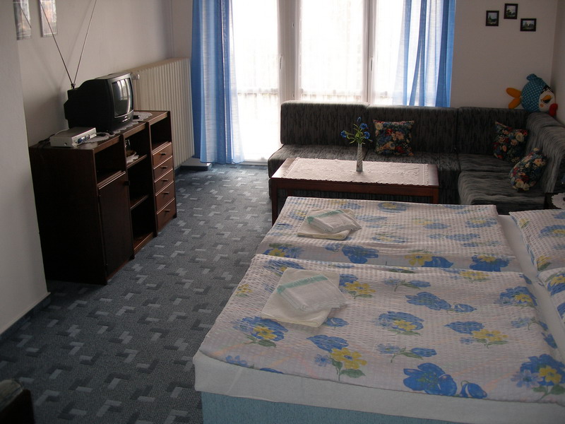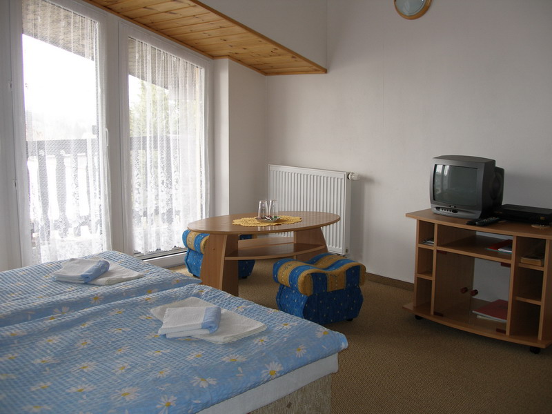 Nabízíme 3 dvoulůžkové, 1 třílůžkový a 2 čtyřlůžkové pokoje s možností přistýlek. Celková kapacita je 23 osob. Každý pokoj má vlastní příslušenství (WC a sprchu nebo vanu), lednici, balkon nebo terasu, TV-SAT.