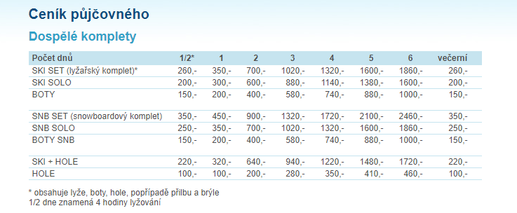 Půjčovna lyžařského vybavení pro celou rodinu. Pro velké skupiny poskytujeme skupinové slevy dle dohody na veškeré vybavení. Zapůjčíme panské, dámské i dětské lyže v různých velikostech a to samé u nás najdete i u snowboardů.