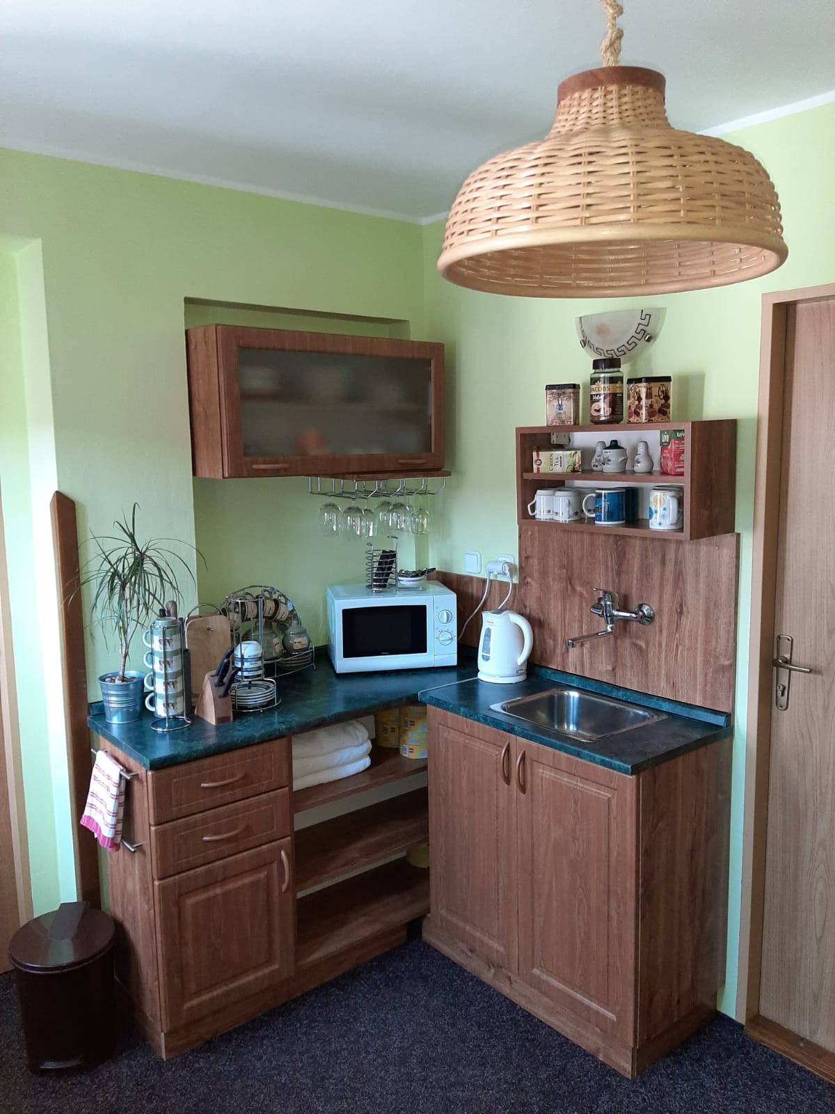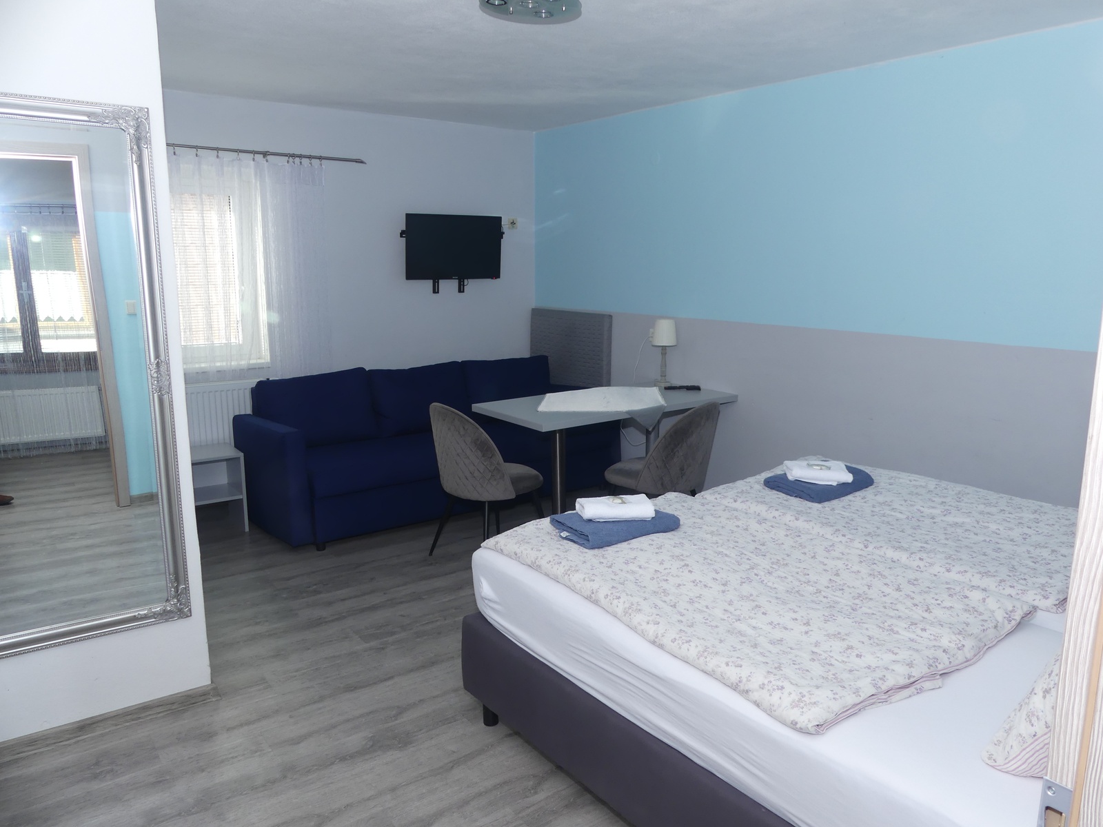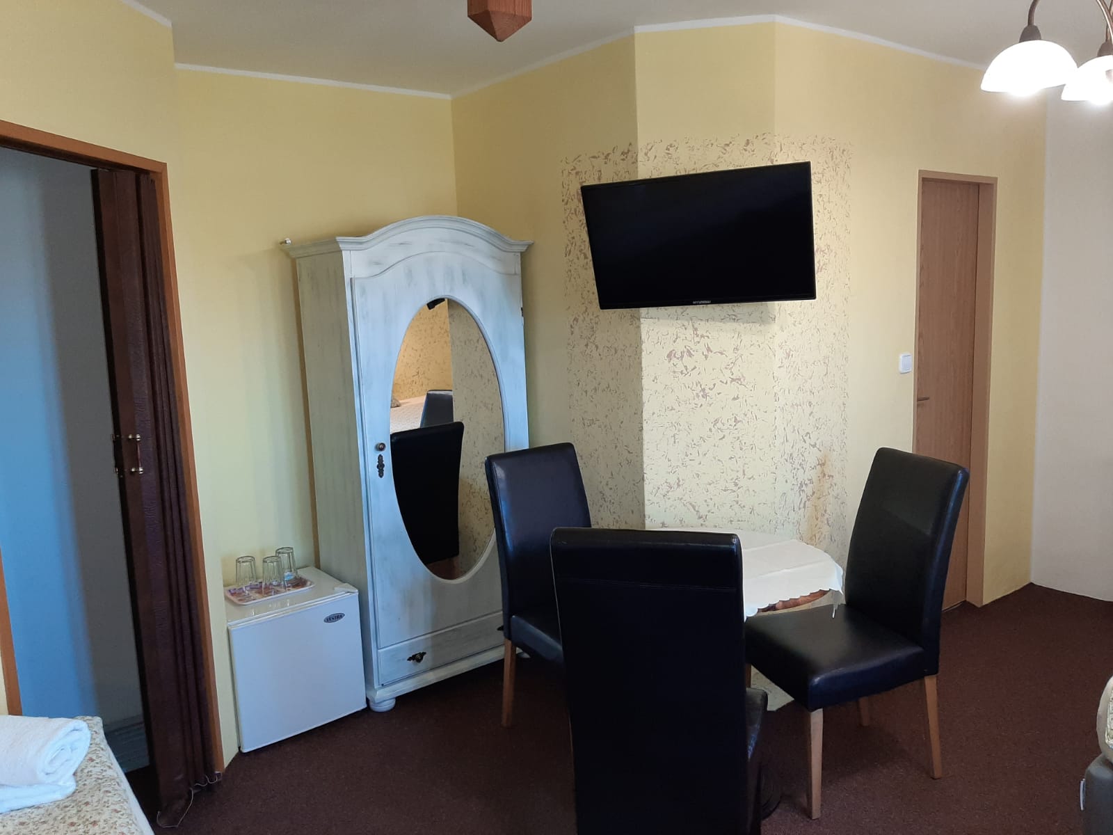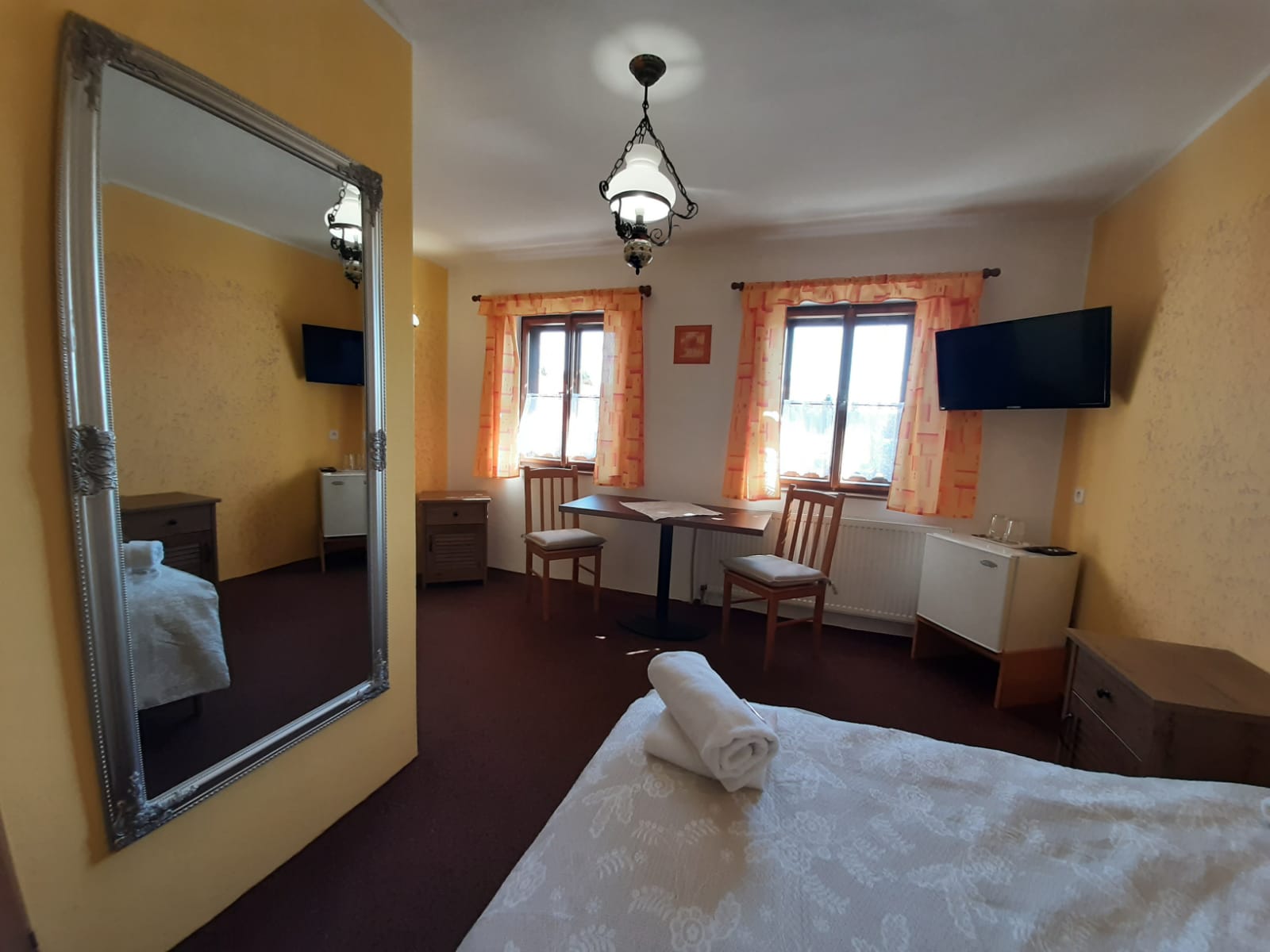 Nabízíme komfortní ubytování s kapacitou pro 22 osob v sedmi pokojích s vlastní koupelnou se sprchovým koutem a sociálním zařízením, televizí, bezdrátovým připojením k internetu, ledničkou.