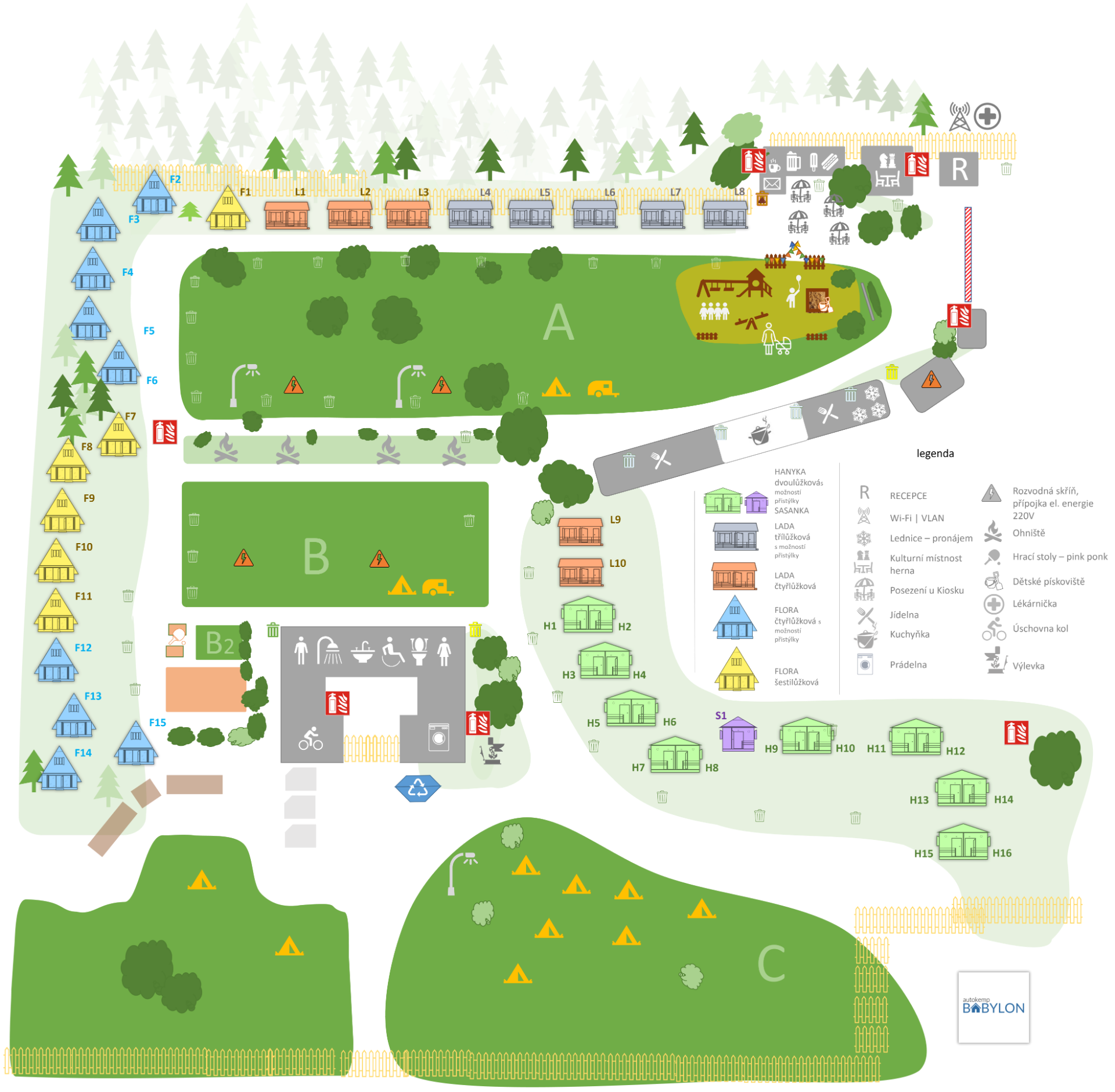 Autokempu BABYLON nabízí ubytování v chatkách, karavanech, stanech i jen tak pod širákem. Na ploše jednoho hektaru rozbijete stan, zaparkujete svůj karavan. Dále je pro vás k dispozici restaurace, dětské hřiště, kuchyňka, společenská místnost, ohniště a mnoho dalšího.