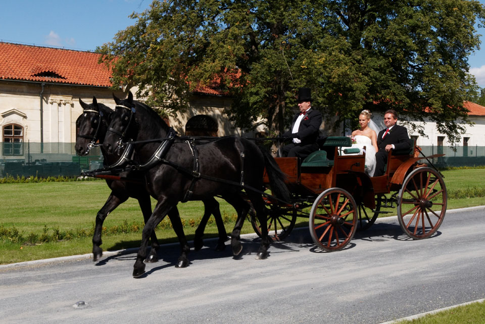 Nabízíme vyjížďky kočárem taženými černými Starokladrubskými hřebci, jednospřeží, dvojspřeží a tandemová zápřež. Možnost výběru ze sedmi druhů kočárů. Všechny akce připravujeme dle přání a požadavku klienta.