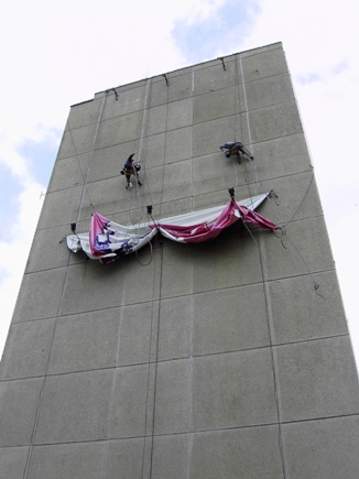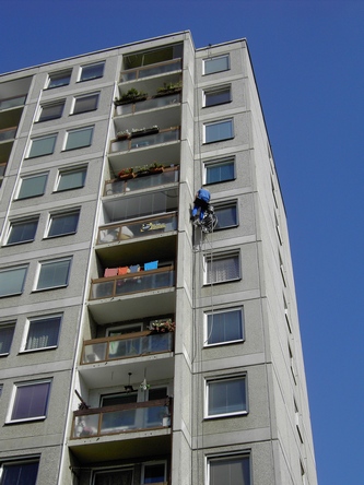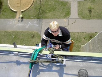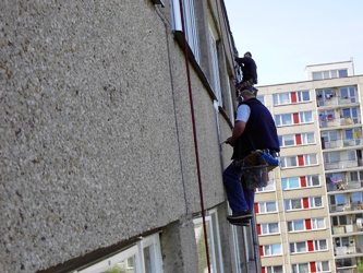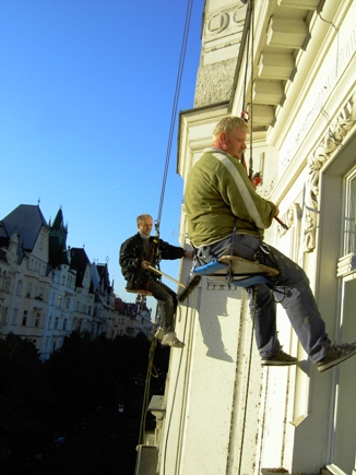 Práci provádíme pomocí horolezecké techniky, která je podstatně levnější než za pomocí lešení nebo montážních plošin či jeřábů.